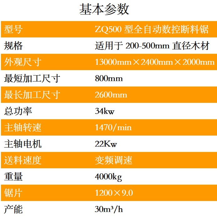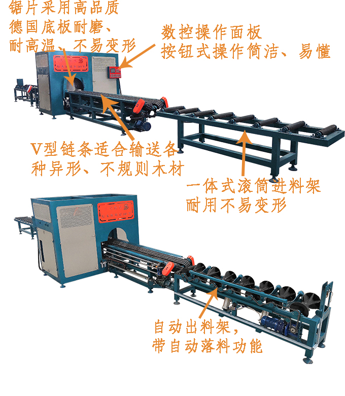 全自動(dòng)數(shù)控斷料鋸是一種用于截?cái)鄨A木的專用機(jī)械,可取代傳統(tǒng)的斷木設(shè)備。本機(jī)是左右鋸設(shè)計(jì),采用手自一體的液壓驅(qū)動(dòng),PLC數(shù)字控制系統(tǒng),只需一名普通工人便可輕松操控,穩(wěn)定性高,加工表面平整光潔,公差在2MM之內(nèi),截?cái)喾秶梢噪S意調(diào)節(jié)。加工長度和速度均可根據(jù)實(shí)際所需規(guī)格隨意調(diào)節(jié),效率高,是傳統(tǒng)截?cái)鄼C(jī)的2-5倍。鋸片配進(jìn)口合金鋸片,使用壽命長.適用于原生木材,板材板方的切斷加工.本設(shè)備采用輸送臺自動(dòng)進(jìn)料,自動(dòng)感應(yīng)壓料,自動(dòng)截?cái)?輸送臺自動(dòng)出料等先進(jìn)裝備,具有操作簡單,安全,效率快,切斷長短可隨意設(shè)定,省時(shí)省工,大大減輕操作者勞動(dòng)強(qiáng)度等優(yōu)點(diǎn).