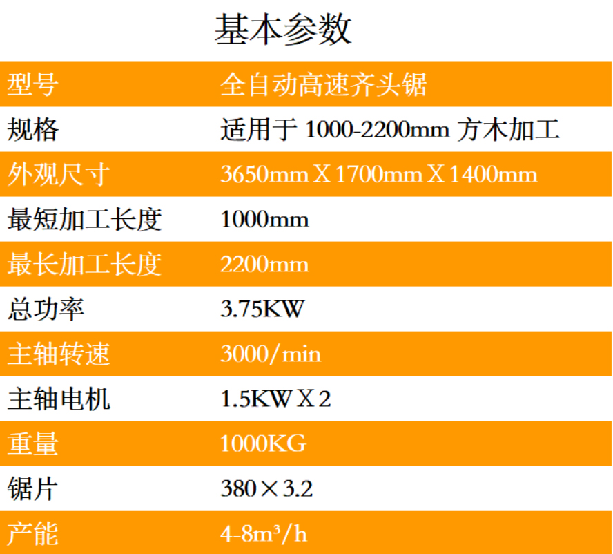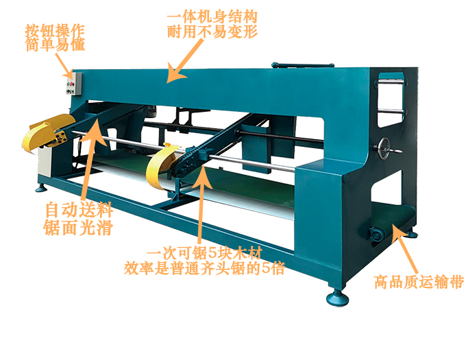 ?全自動高速齊頭鋸一體式機身設計、采用國標鋼材、結構科學、操作簡單、鋸面光滑、誤差小、效率高、故障率低、維護簡單、速度可調,一次可以鋸五塊木板,最短1米,最長2.2米,中間尺寸可隨意調節