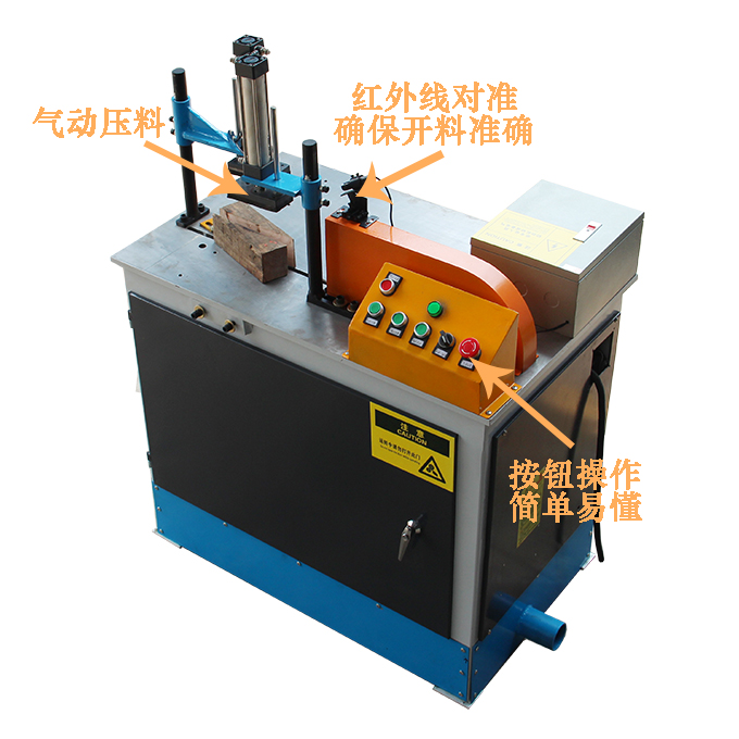 1.半自動斜切鋸采用氣動壓料,帶紅外線對準裝置,確保開料準確。